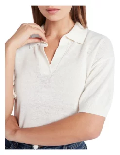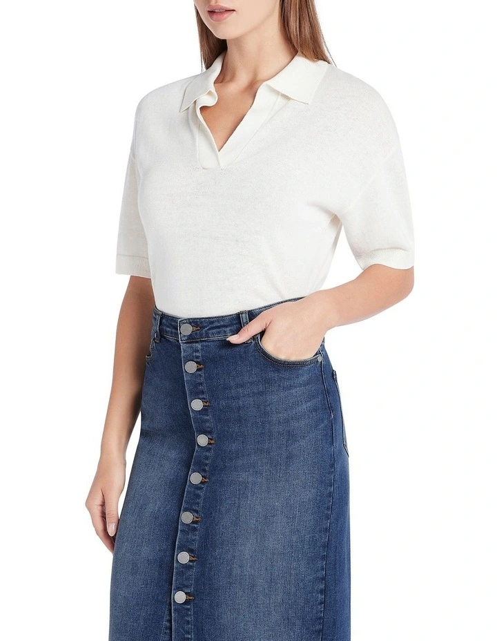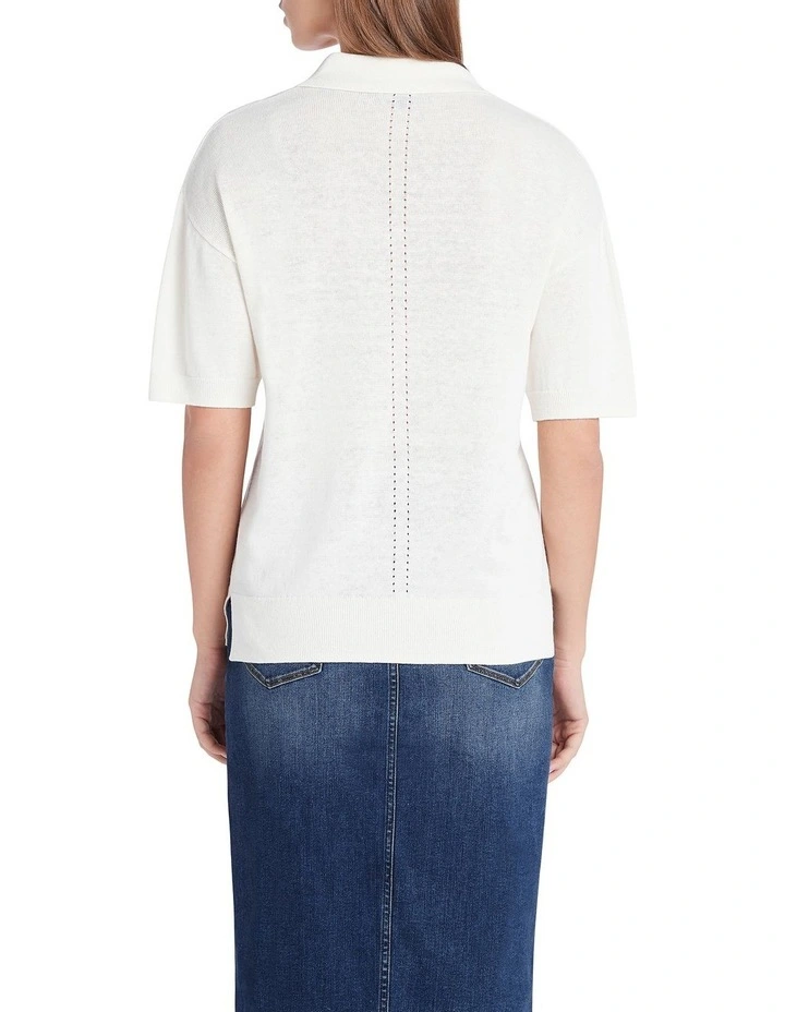 Showcasing classic polo styling, this short sleeve knit polo allows for easy pairing within crisp ivory, made from a soft yarn blend of linen and cotton. Creating a relaxed fit with dropped shoulder shaping, the top is further enhanced by an open V-neckline with soft rib collar, pointelle detailing through centre-back, and fine rib trim at the cuffs and body hem.
