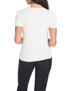 Lightweight and luxurious, this short sleeve knit top is made from a luxe yarn blend containing cotton, cupro and wool, revealing a crisp ivory colouring thats always easy to pair. Featuring vertical ribbing throughout, the top creates a slim fit accentuated with feature rib detailing at the front, and fine rib trim at the round neckline, sleeve cuffs and body hem.