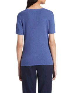 Sumptuously soft to the touch, this short sleeve knit top is made from a luxury yarn blend containing cotton, cupro and wool, which works to create a lightweight look in captivating pacific blue. Offering a regular fit, the top reveals intricate rib detailing throughout, accentuated by fine rib trim detailing at the flattering scoop neckline.