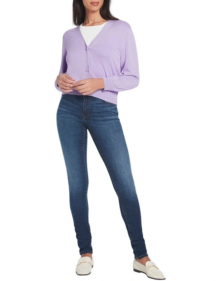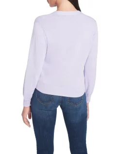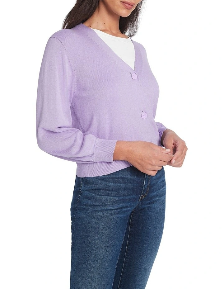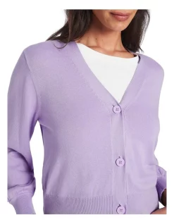 Creating a lightweight look that makes for easy layering, this long sleeve knit cardigan is made from a fine yarn blend of cotton and sustainable viscose in a pale pansy purple hue. Pairing voluminous balloon sleeves with relaxed shaping through the body, the cardigan is further accentuated by dyed-to-match buttons at the front fastening and fine rib trim throughout.