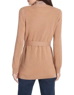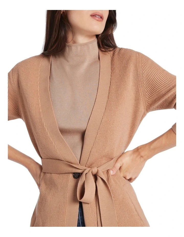 An effortless neutral you will come to rely on, this long sleeve knit cardigan creates a flattering long-line silhouette, cinched in at the waist with a removable self-tie belt. Camel in colour, the cardigan is gorgeously soft to the touch, revealing a textured vertical knit throughout its slim fit, finished with plain-knit trim through the front and hem, and a single contrast button at the front.