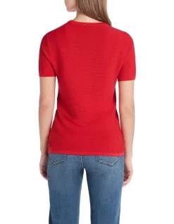 Endlessly appealing in vibrant poppy red, this knit top feels soft against the skin in pure cotton, as it creates a textured rib across the horizontal. Delivering flattering regular shaping within a neat short sleeve design, the top is further enhanced by fine rib trim detailing at the crew neckline, sleeve cuffs and straight body hem.