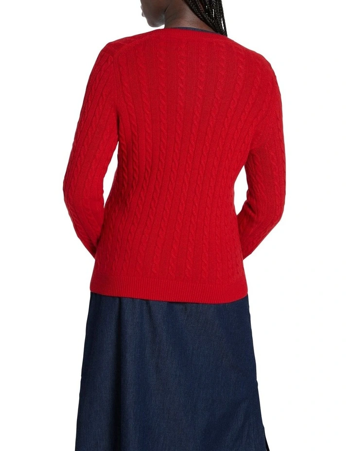 Endlessly wearable, this long sleeve, regular fit knit sweater will become a go-to piece in your autumn-winter wardrobe. Vibrant scarlet in colour, the sweater is made from a soft blend containing cotton, lambswool and cashmere in a mid-weight yarn, knitted to reveal cable knit detailing throughout, accentuated with rib trim at the deep V-neckline, cuffs and body hem.Β
