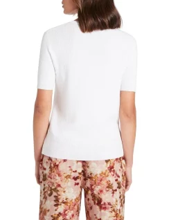 Easy to pair in crisp ivory, this knit top delivers classic tee styling, complete with flattering round neckline, short sleeves and a regular fit through the body. Revealing soft texture within an intricate woven stitch, the top continues to appeal with fine rib trim detailing at the neck, sleeve cuffs and straight body hem.