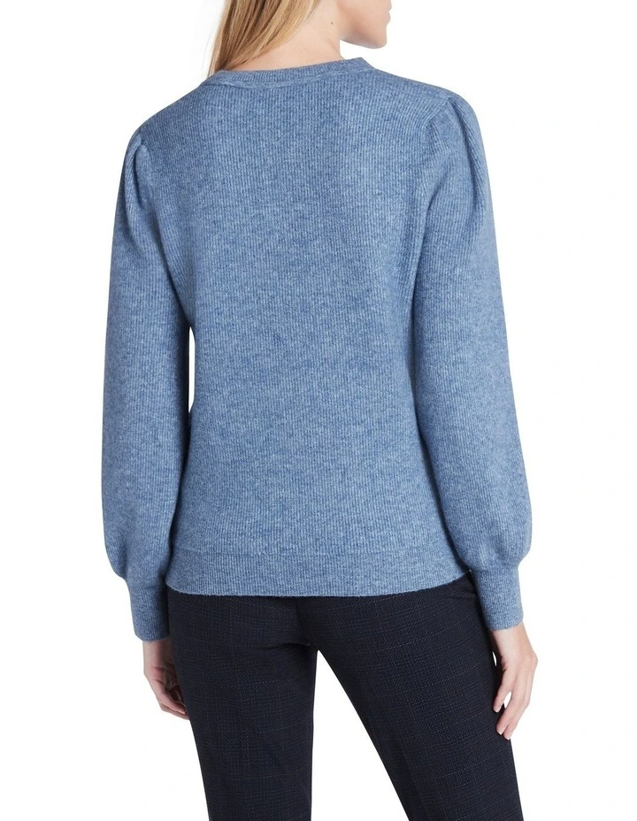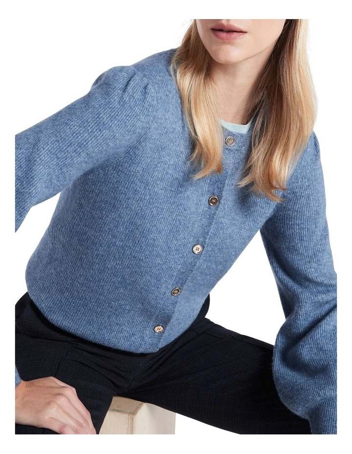 Fastening at the front with statement gold buttons, this long sleeve knit cardigan creates a beautiful layering piece through colder months, offered in a steel blue colouring. Creating a regular fit with a neat crew neckline, the cardigan is further enhanced by tuck shaping at the shoulder and voluminous blouson sleeves drawn in at the wrist with fine rib trim.