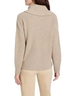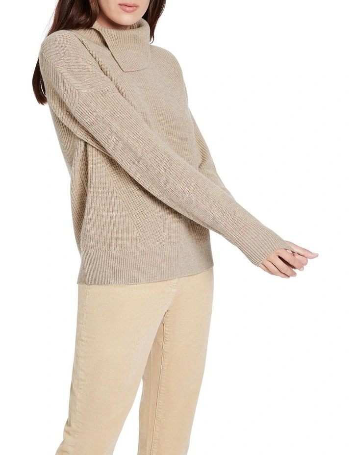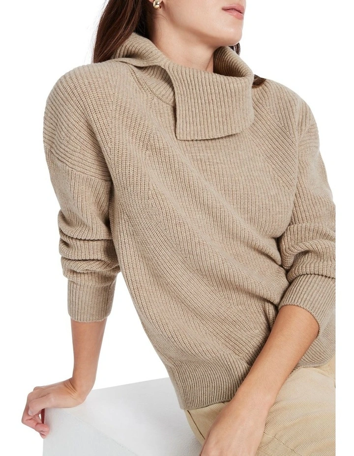 So soft youll never want to take it off, this long sleeve knit sweater reveals a neutral malt melange colouring for easy pairing, made from pure Australian Merino wool. Weighted for winter, the sweater shows off a textured chunky rib stitch within an easy relaxed fit, further enhanced by dropped shoulder shaping and an asymmetrical fold-over neckline.