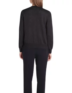 Creating a soft, lightweight look, this knit cardigan reveals a delicate shimmer within black, made from a luxe yarn blend accented with metallic thread throughout. Delivering relaxed shaping with a flattering round neckline, the cardigan is completed by statement metallic buttons at the front fastening, open patch pockets at the waist, and fine rib trim at the neck, cuffs and hem.