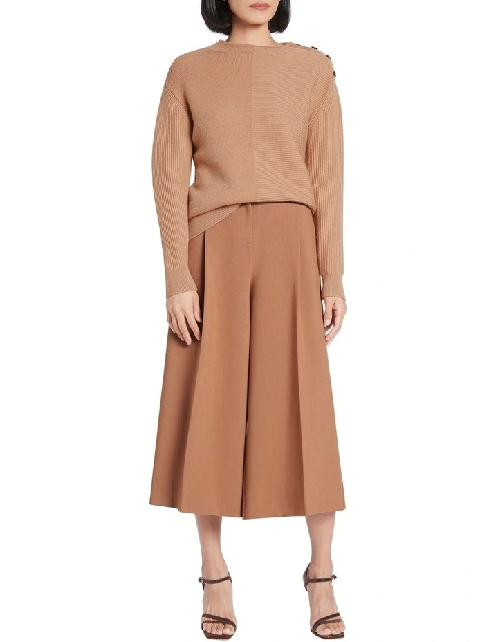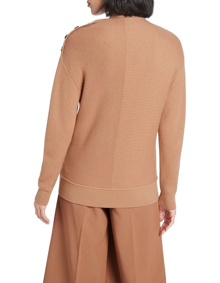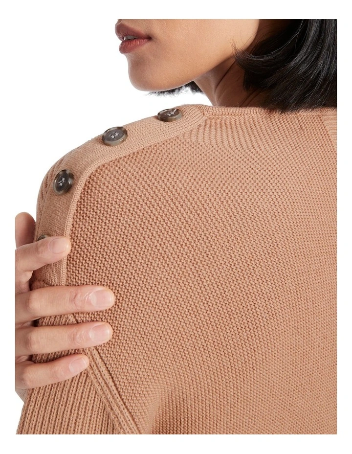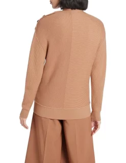 Creating interest within a mix of textures, this long sleeve knit sweater feels gorgeously soft to the touch, offered in a neutral camel colouring. Featuring a regular fit with slight dropped shoulder shaping, the sweater flatters further with its high mock neckline, tortoiseshell button detailing at the shoulder, and neat rib trim at the body hem.