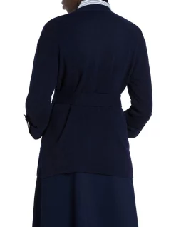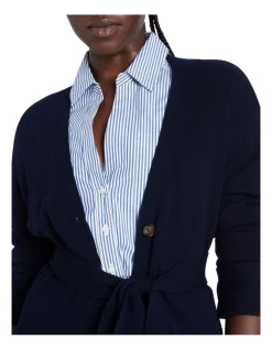 The perfect layering piece to call on as temperatures drop, this long sleeve knit cardigan is offered in a midnight blue hue, made from super soft, pure new wool. Drawing in at the waist with a self-tie knit belt, the cardigan creates a regular fit to a longer-line length, completed by a tortoiseshell button front fastening, pockets at the hip, and a button-tab feature to secure rolled sleeves.