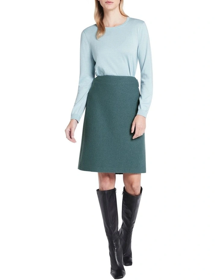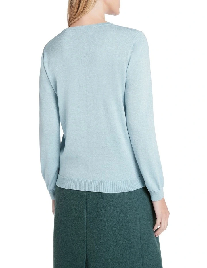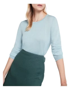 Shimmering delicately within a beautiful sea mist blue, this long sleeve knit top feels effortless and lightweight, made from a luxe wool blend shot through with lurex accents. Draping easily through a relaxed slim fit, the top is further enhanced by soft rib trim detailing at the open crew neckline, sleeve cuffs and body hem.