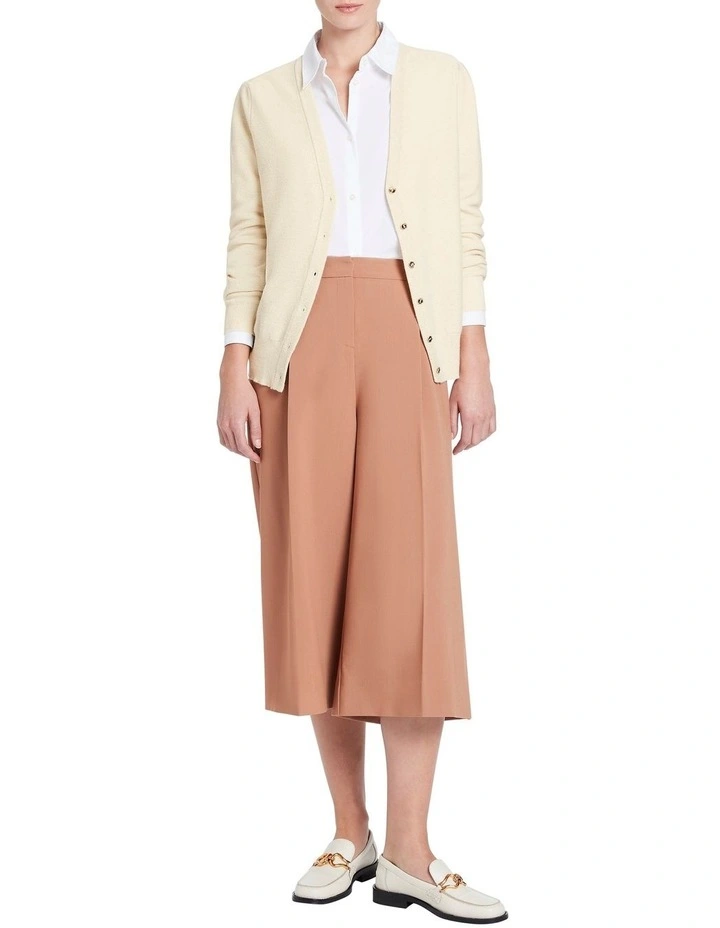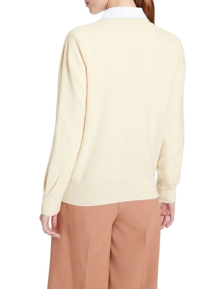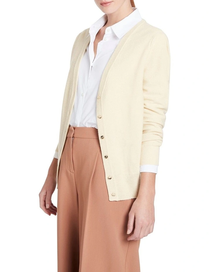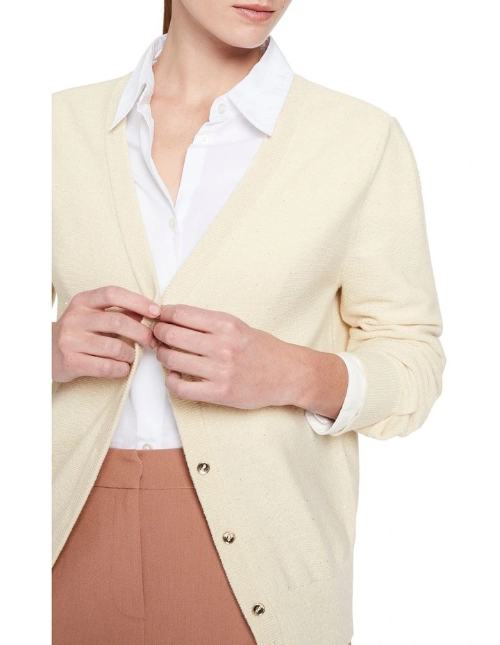 Shimmering softly, this long sleeve cardigan creates a dazzling layering piece in rich ivory, made from a wool blend yarn with lurex and sequin accents. Fastening at the front to reveal an open V-neckline, the cardigan creates a slim fit through the body, with subtle blouson sleeves finished with tuck shaping at the shoulder and neat rib cuffs.