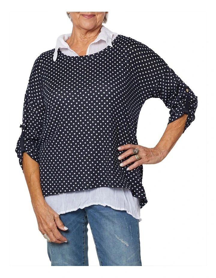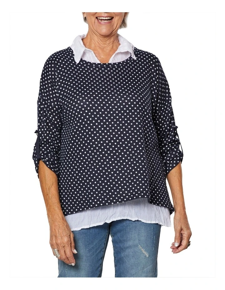 This relaxed fit top features a roundΒ neckline with long sleeves and versatile button tab detailing. With the added bonus of the sleeveless crushedΒ collar shirt that is included and worn underneath on the model. Pair back with jeans for day or dress up with navy pants for a night out. Style that fits the way you live.