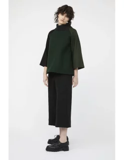 The mosaic range pays homage to previous keegan collections & represents the brands ongoing commitment to sustainable & ethical practices. Each jumpers exterior is comprised of in-house fabric offcuts & remnants, which may have otherwise been destined for landfill. Thick green, olive & black wool blend fabrics come together to form a comfortable & flattering A-line silhouette. Extra wide, cropped raglan sleeves allow for easy layering underneath. The relaxed turtleneck is made from a knitted fabric with moderate stretch & matches our Mosaic Pants