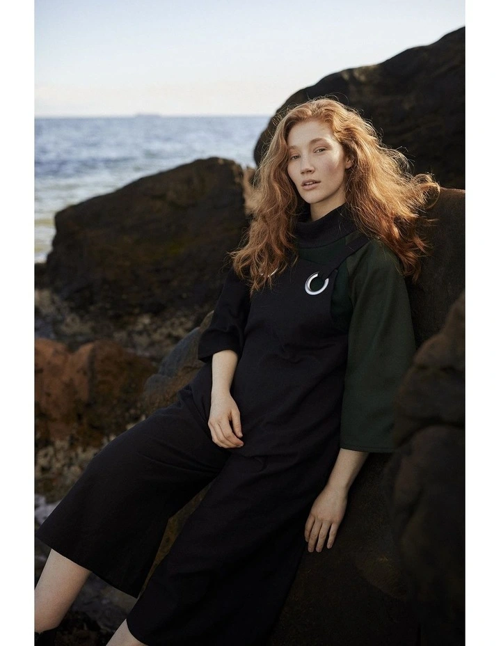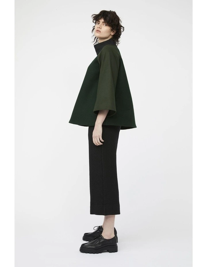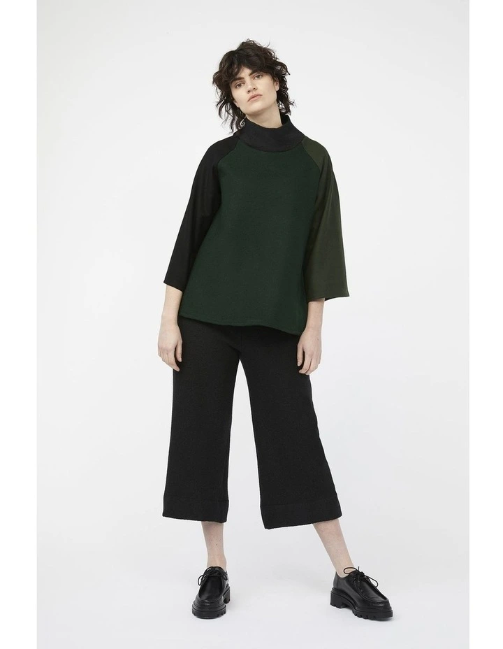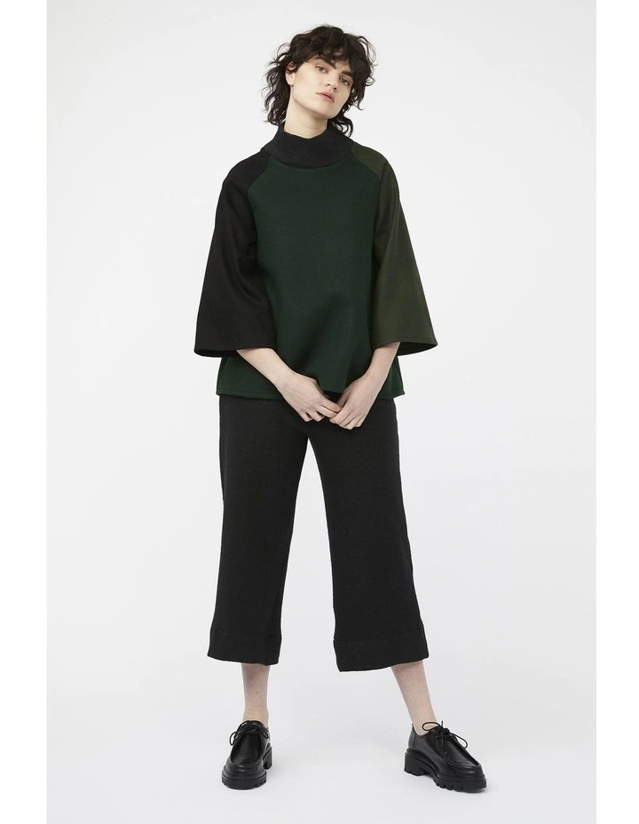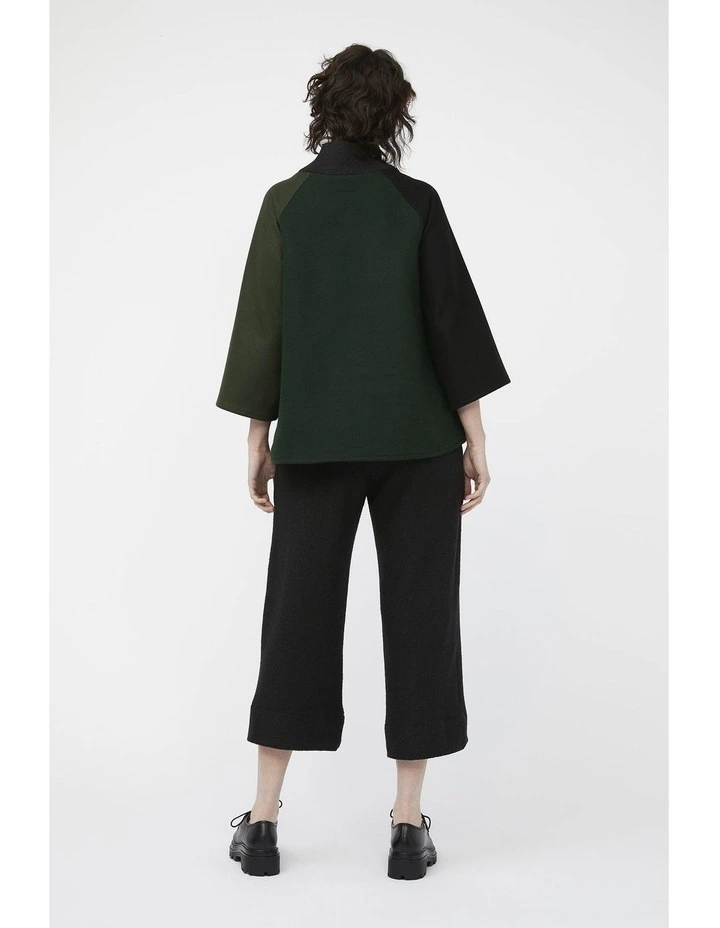 The mosaic range pays homage to previous keegan collections & represents the brands ongoing commitment to sustainable & ethical practices. Each jumpers exterior is comprised of in-house fabric offcuts & remnants, which may have otherwise been destined for landfill. Thick green, olive & black wool blend fabrics come together to form a comfortable & flattering A-line silhouette. Extra wide, cropped raglan sleeves allow for easy layering underneath. The relaxed turtleneck is made from a knitted fabric with moderate stretch & matches our Mosaic Pants