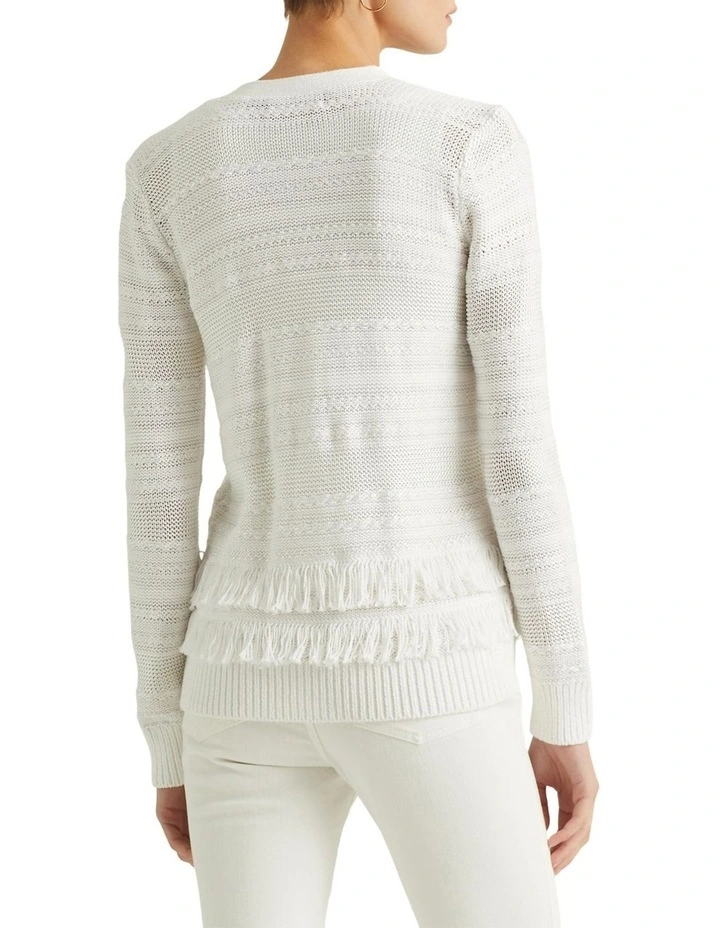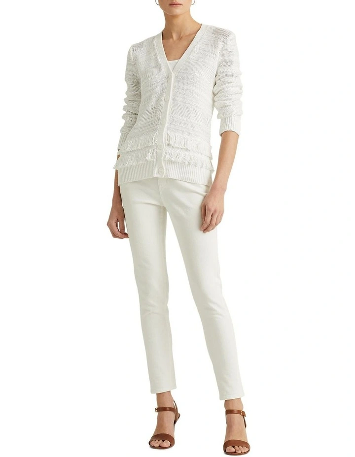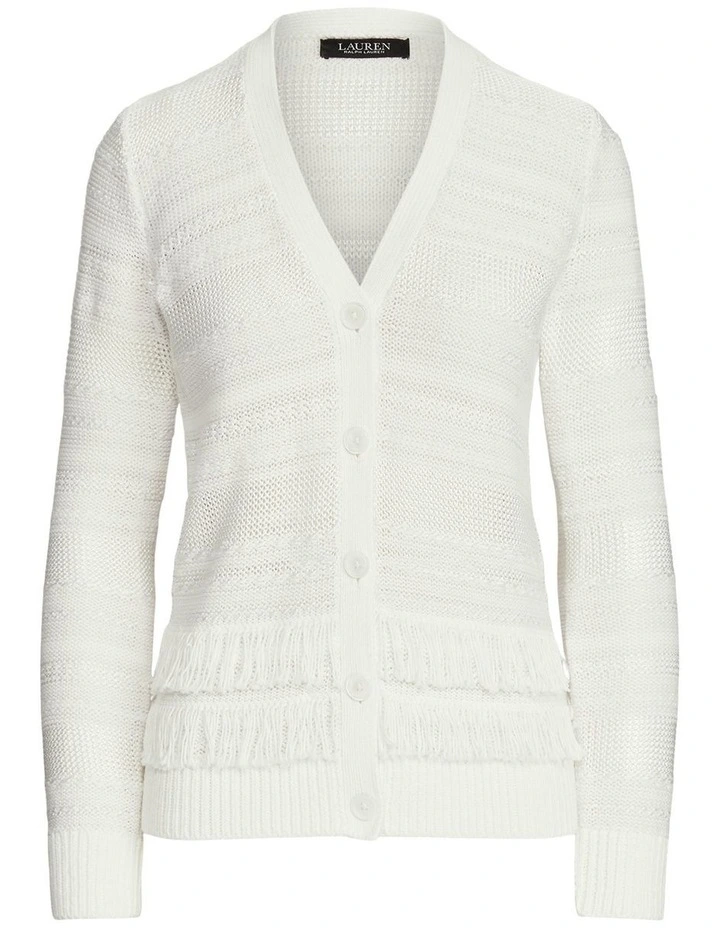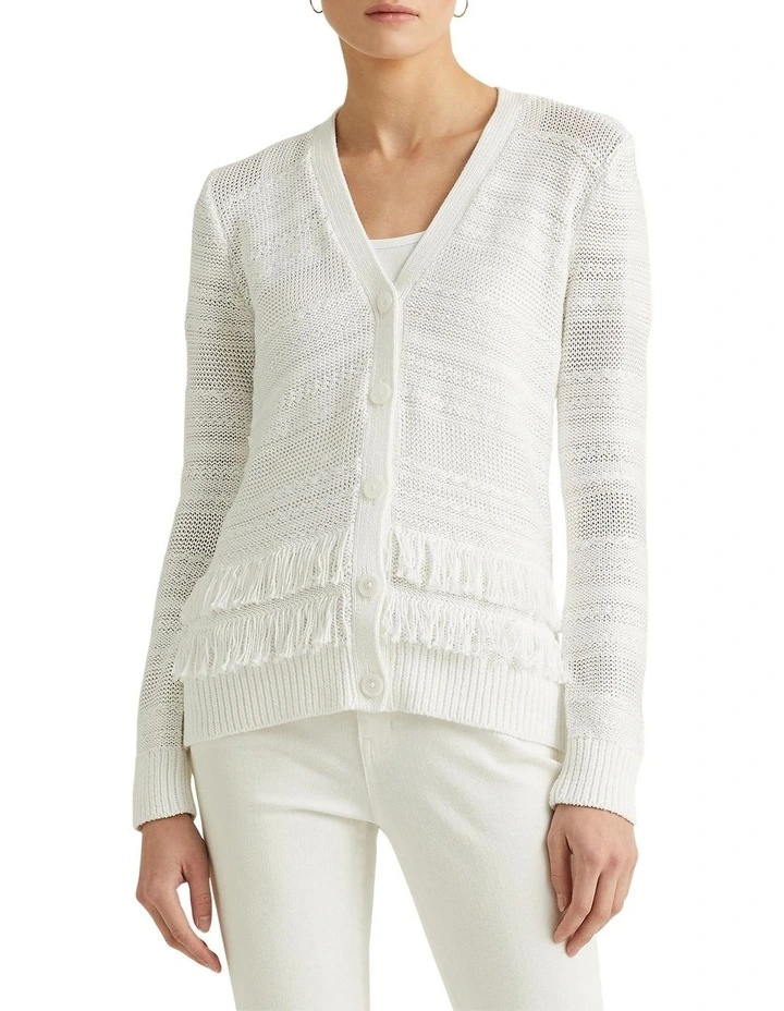 Spun from a lightweight blend of cotton and combed linen for a soft hand and airy finish, this elegant cardigan is an essential warm-weather layering piece. It’s defined by a sleek, body-hugging fit and Lauren’s signature pearlized buttons, and fringe detailing offers a playful and effortless sensibility.