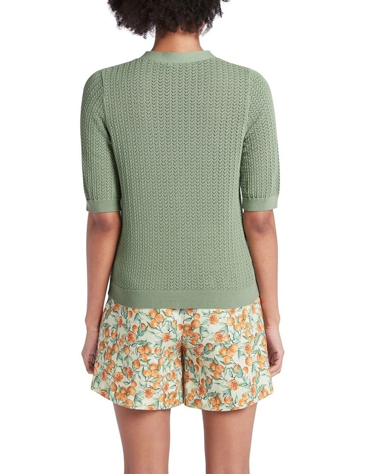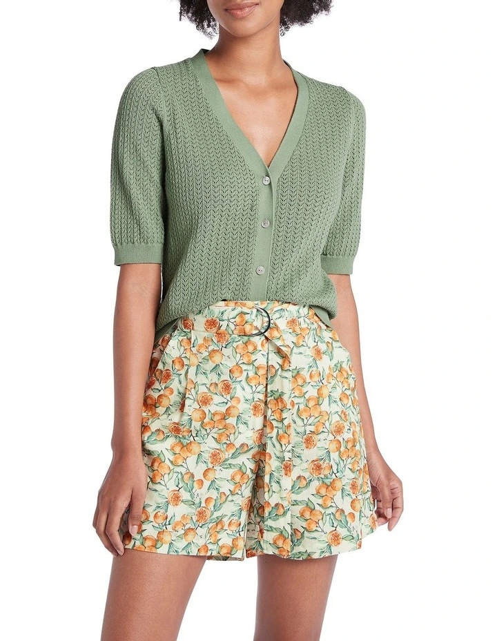 Using a woven knit stitch to create a delicate, lightweight look, this short sleeve knit cardigan feels perfectly summery as it shows off a gorgeous pale fern green. Offering relaxed shaping through the body, the cardigan fastens with pearlescent buttons to create a deep V-neckline, with further detail found in fine rib trim at the neck, front fastening, cuffs and hem.