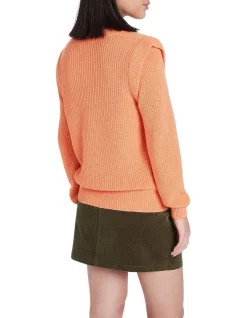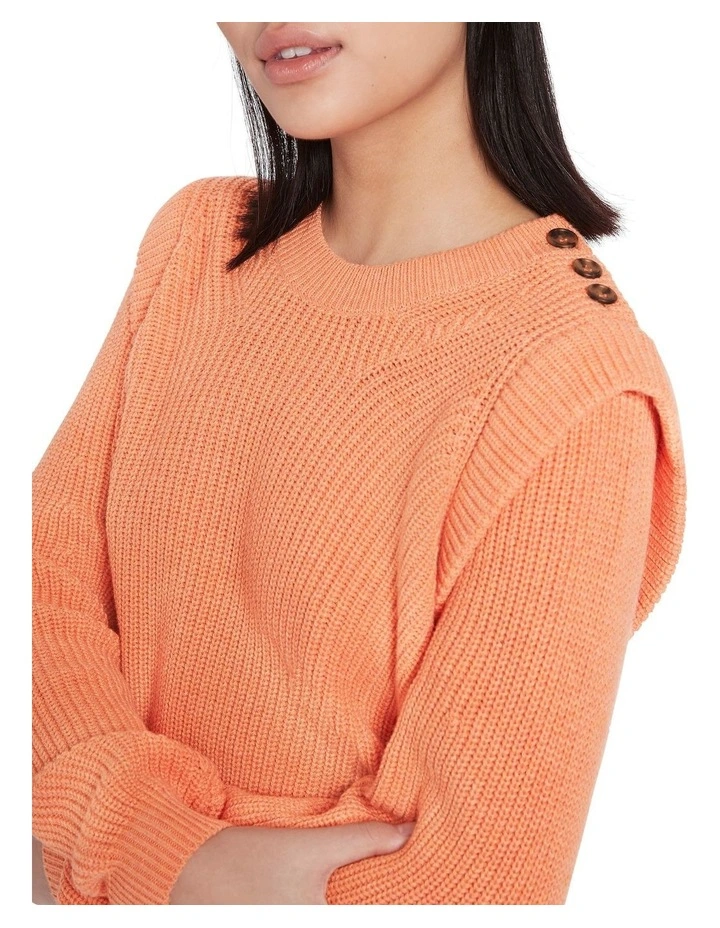 Effortless within its relaxed, easy fit, this long sleeve knit sweater shows off a beautiful salmon colouring, made from a soft yarn blend containing wool and cotton. Textured to the touch, the sweater features a chunky vertical rib, further enhanced by a neat crew neck, cap shoulder detailing, subtle balloon sleeves, and an asymmetric button feature at the shoulder.