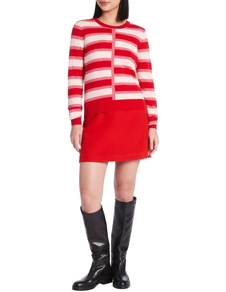 Luxuriously soft, this lightweight knit sweater is made from a fine yarn blend containing wool, cotton and cashmere, revealing bold colour blocking within an irregular stripe. Flaunting shades of scarlet, pink and ivory, the sweater offers a classic fit with long sleeves and a flattering crew neckline, further enhanced by scarlet rib trim at the neck, cuffs and body hem.