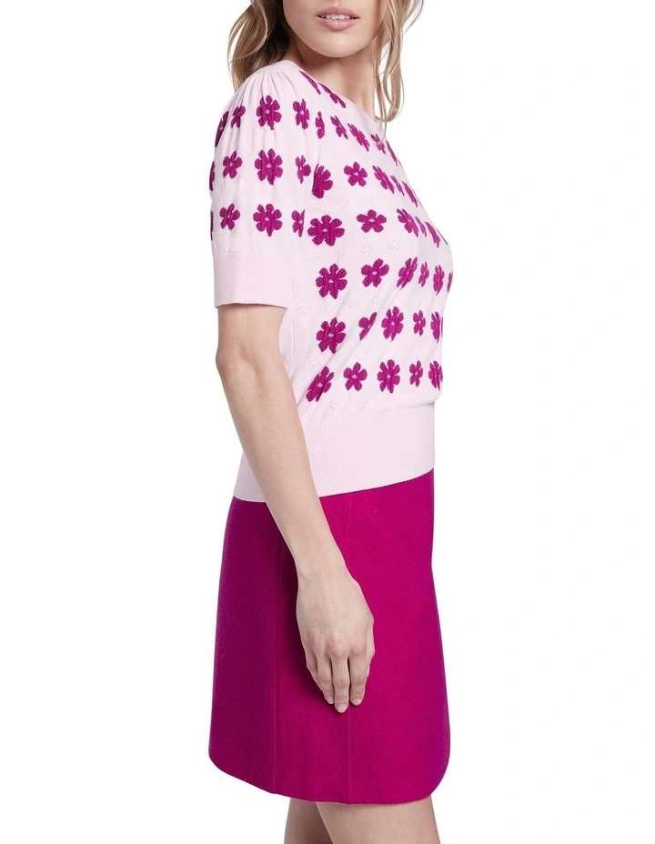Drawing attention to its cute flower design, this short sleeve knit top offers perfect pairability within a pale lilac base. Lightweight in style, the top offers a regular fit with puff shaping at the shoulders, with further detail found in its intricate pointelle heart pattern and fine rib trim at the crew neckline, sleeve cuffs and broad body hem.
