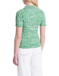 Tightly knitted so it curves close to the body, this knit top utilises polo styling to create interest at the soft collar, open V-neckline and short sleeves. Featuring a wide vertical rib throughout, the top uses space dye yarn to show off shades of green and ivory, finished with lightweight flutter hemming both at the cuffs and body hem.