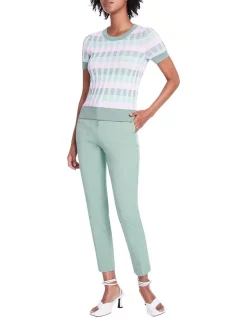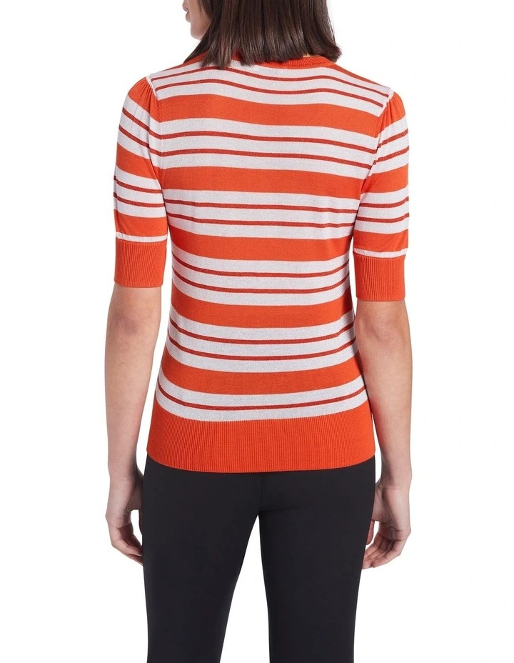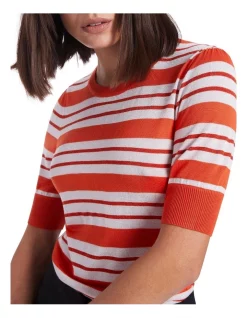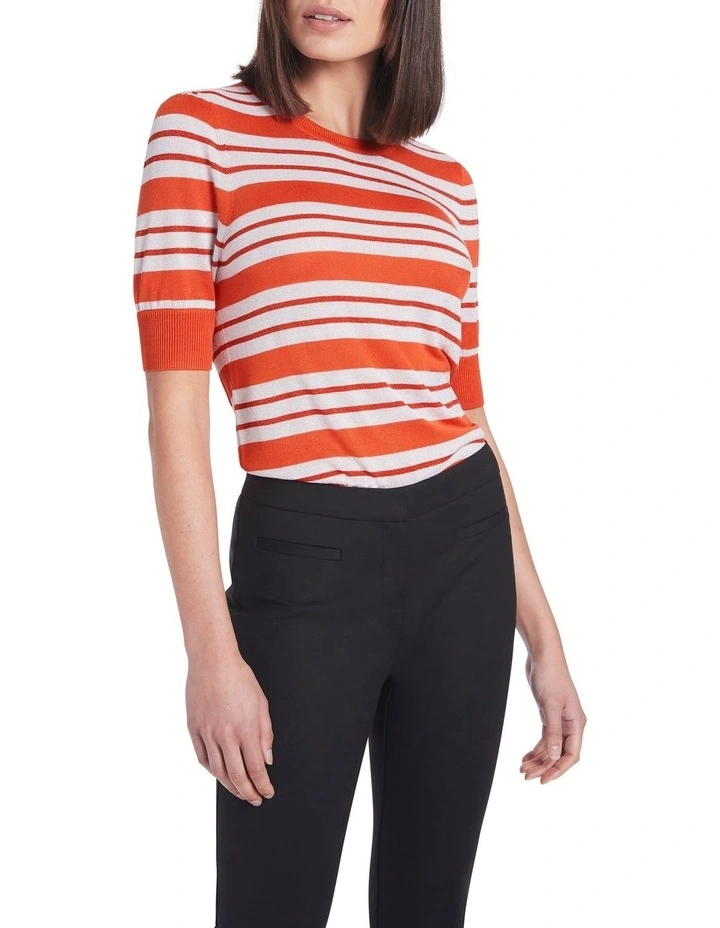 Shimmering softly within a two-tone horizontal stripe, this knit top creates a beautiful lightweight look, in shades of fiesta redΒ and white. Flattering within a regular fit, the top is further accentuated by neat short sleeves with gathers at the shoulders, and fine rib trim detailing at the crew neckline, cuffs and body hem.
