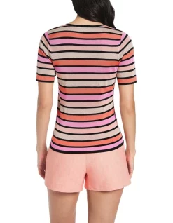Showcasing shades of summer within its gorgeous shimmering stripe, this knit top plays with pink, mango and warm metallics, beautifully outlined in black. Creating a lightweight look within a flattering short sleeve design, the top offers a slim fit through the body and sleeve, accentuated by a contrast black neckband at the crew neckline.