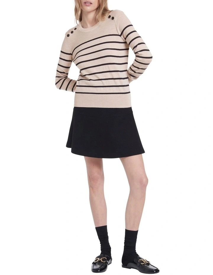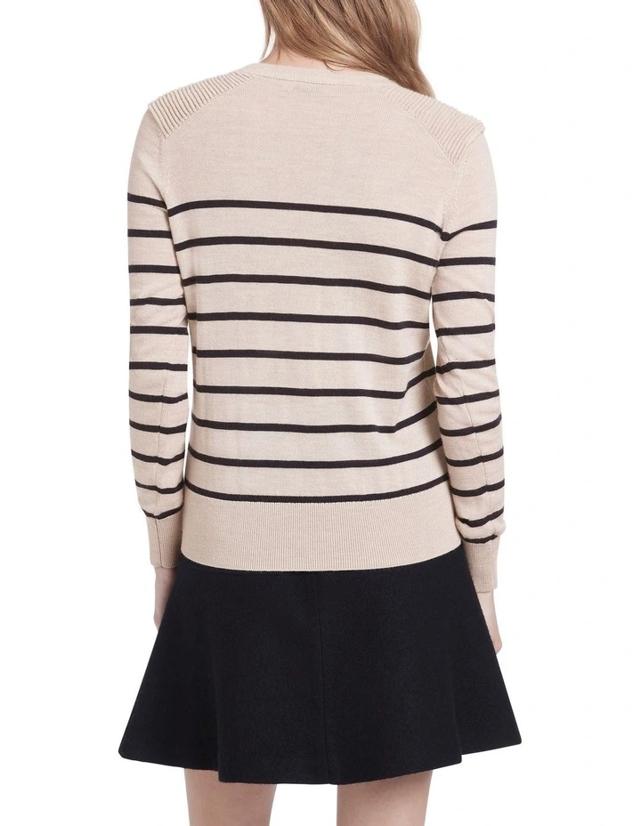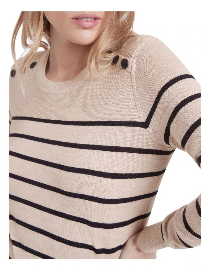 Exquisitely soft, this lightweight knit top is made from pure Australian Merino wool, offered in a peachy pale shell colouring with a contrast horizontal stripe through the body and sleeves. Offering a slim fit with long sleeves, the top is further enhanced by rib and button detailing at the shoulders, and fine rib trim at the round neckline, sleeve cuffs and body hem.