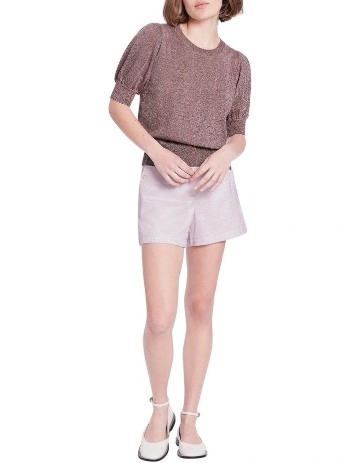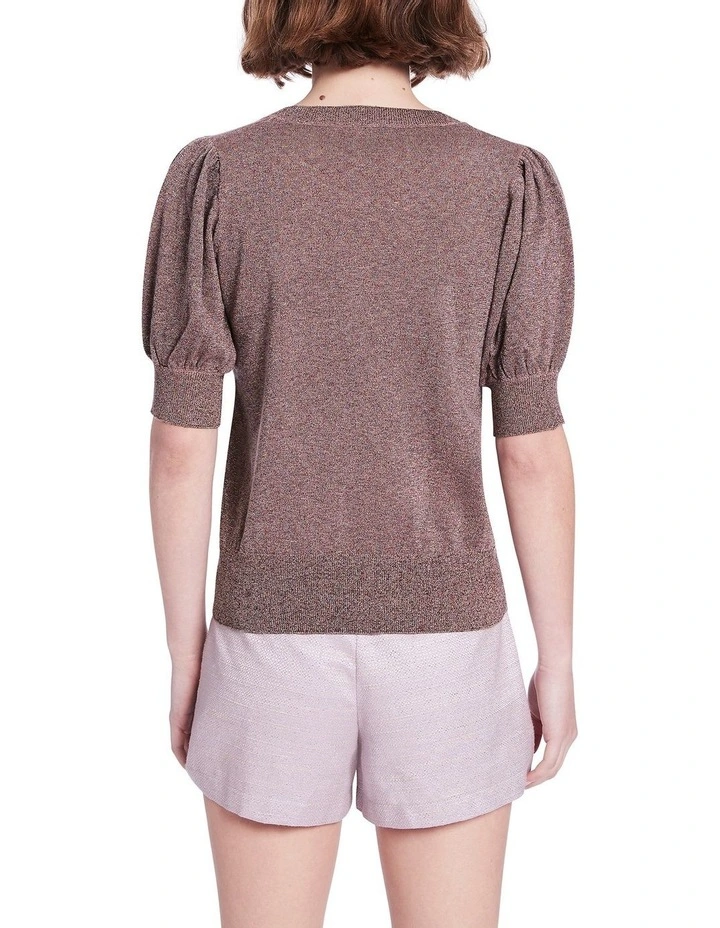 Creating volume through the shoulders, this knit top flatters effortlessly with its short puff sleeves, while creating a slim fit through the body drawn in at the waist with a broad waistband. Lightweight in style, the top is made from a multi-tonal pink yarn shot through with metallic accents, enhanced by rib trim detailing at the round neckline, cuffs and hem.