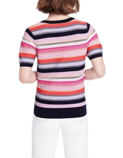 Showcasing a bold multi-tonal stripe, this short sleeve knit top is all about texture, revealing alternating styles of plain stretch, Ottoman and zig-zag stitching that flow across the horizontal. Using a fine yarn blend to create a lightweight look, the top delivers a flattering regular fit, further enhanced by solid navy detailing at the rib round neckline, cuffs and body hem.a
