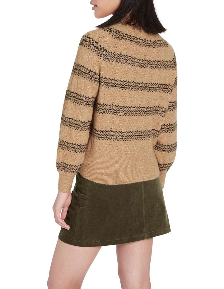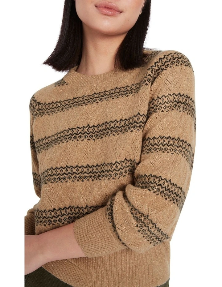Shimmering delicately within a soft camel colouring, this long sleeve knit sweater shows off a textured chevron design, accentuated with a neat geometric horizontal stripe. Offering a regular fit drawn in at the waist with a broad rib waistband, the sweater is further enhanced by raglan shoulders and subtle balloon sleeves, with further rib detailing at the crew neckline and cuffs.