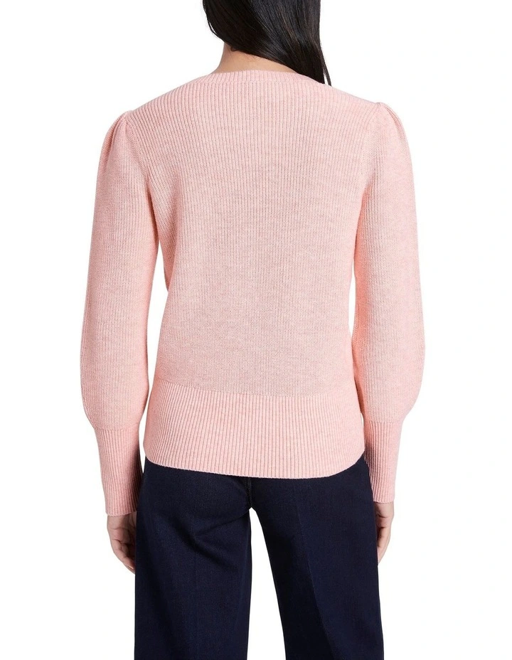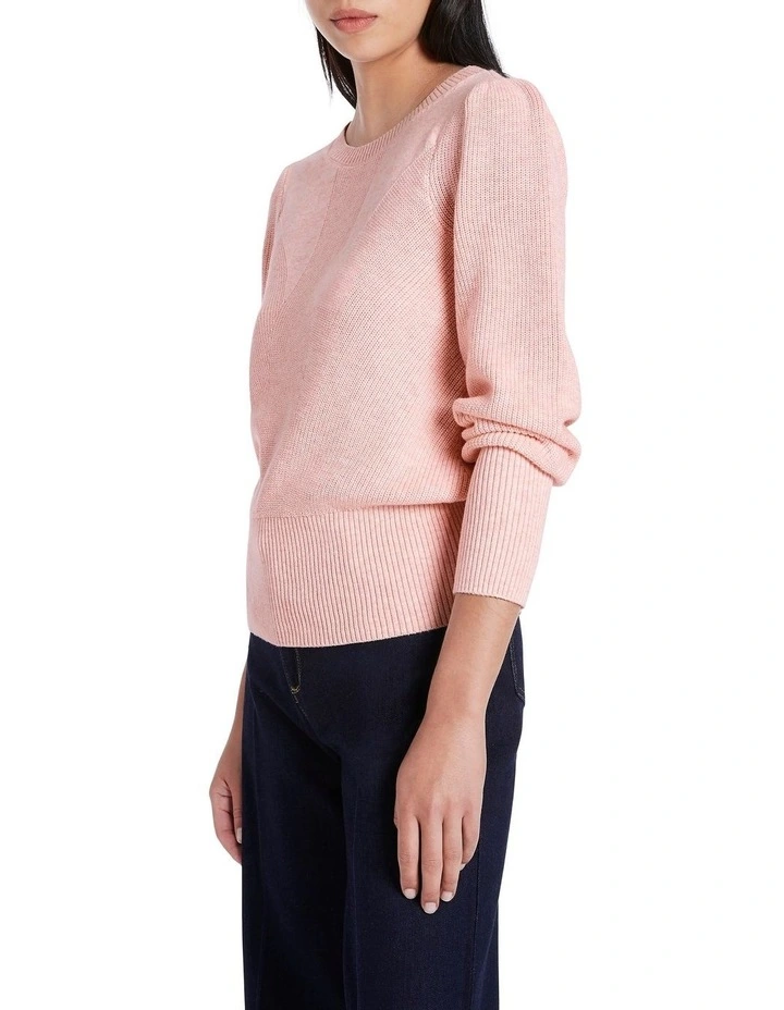 Revealing a soft shade of rose pink, this long sleeve knit sweater wraps you up in a super soft yarn blend of cotton and wool, featuring intricate rib stitch detailing throughout. Offering a relaxed fit drawn in at the broad ribbed waistband, the sweater is further enhanced by a round rib neckline, gathers at the shoulders, and long sleeves with extended rib cuffs.Β