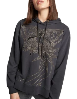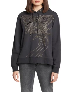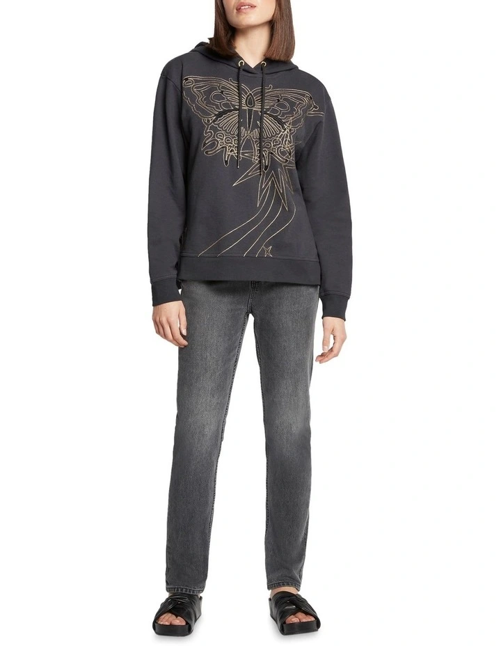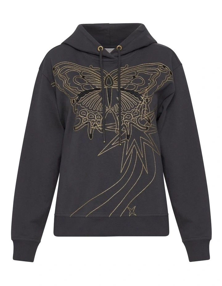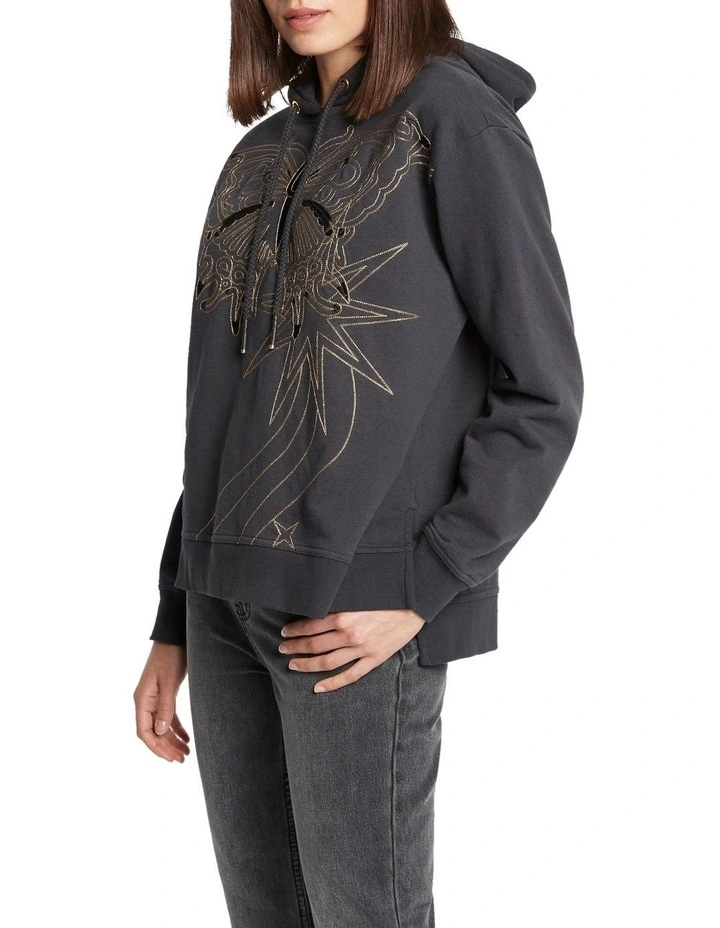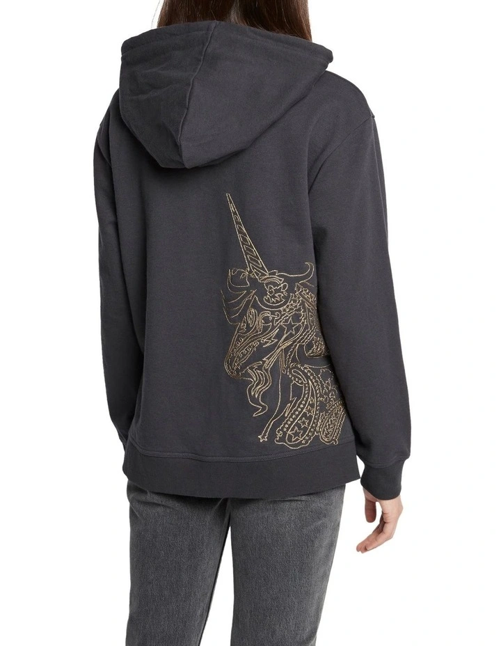 Washed black in colour, this hoodie uses gold embroidery to reveal intricately embellished artwork depicting a starburst and butterfly through the front and a unicorn at the back. Made from a blend of recycled cotton, the hoodie offers an oversized, relaxed fit with dropped shoulder shaping and a full, functional hood, finished with soft rib trim at the cuffs and body hem.