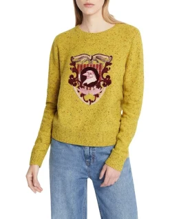Chartreuse in colour, this captivating knit sweater reveals a contrast speckle through the wool-blend yarn, which plays perfectly against the bold colouring of its crest-style embellishment across the chest. Feeling soft against the skin, the sweater creates a slim fit through the body with slight fullness at the long sleeves, finished with chunky rib trim at the neck, cuffs and body hem.