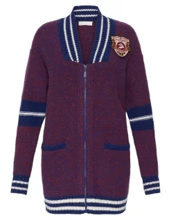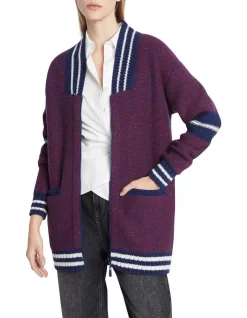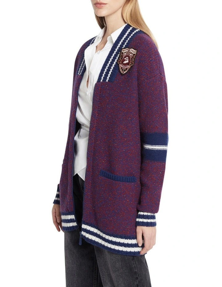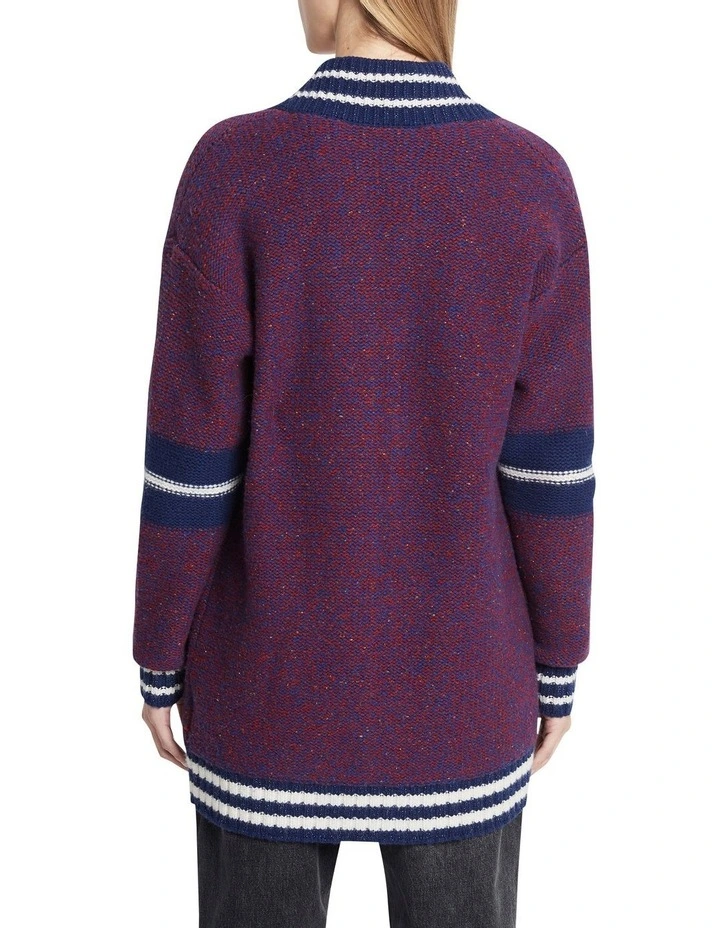 Oversized by design, this wool-blend knit cardigan reveals a slouchy, relaxed fit, complete with dropped shoulder shaping within a longline silhouette. Showing off a two-tone red and navy colouring, the cardigan is further accentuated by a zip front closure, navy-edged patch pockets at the hip, and a navy and ivory stripe chunky rib trim at the collar, cuffs and hem.