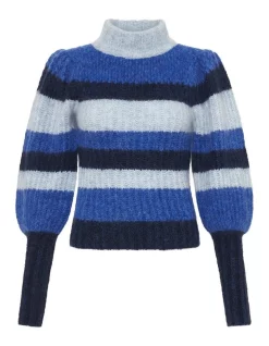 Keeping you warm as winter sets in, this knit sweater pairs fluffy mohair and wool within a soft yarn blend, to show off a variegated stripe in shades of blue, navy and grey. Featuring a high mock neckline and regular fit through the body, the sweater creates volume at the blouson style long sleeves, which are drawn in at the wrist with an extended length rib cuff.