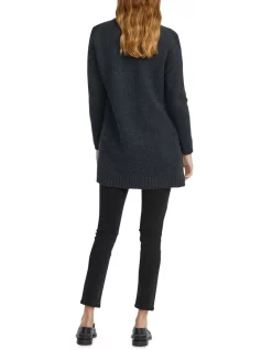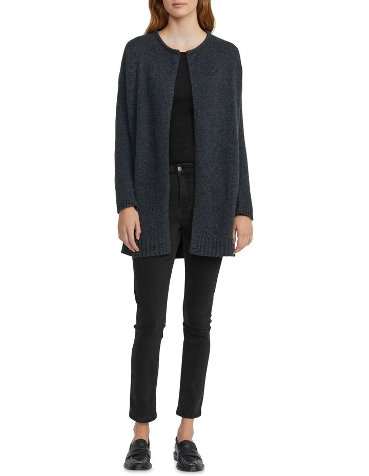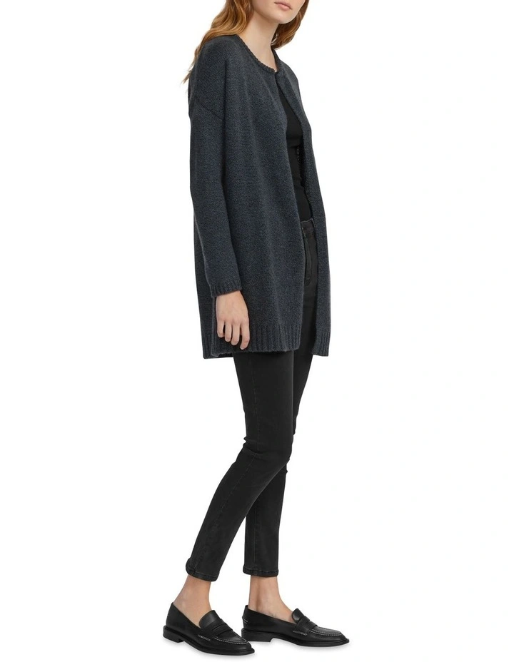 The cashmere open cardigan has a long and loose body with drop shoulder and slim sleeve. A great alternative to a jacket.