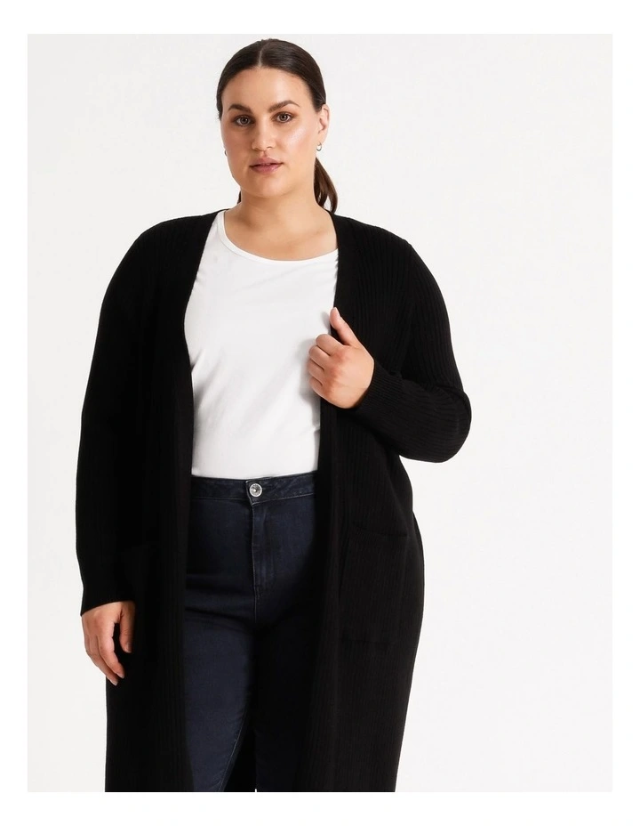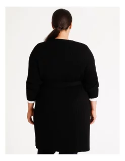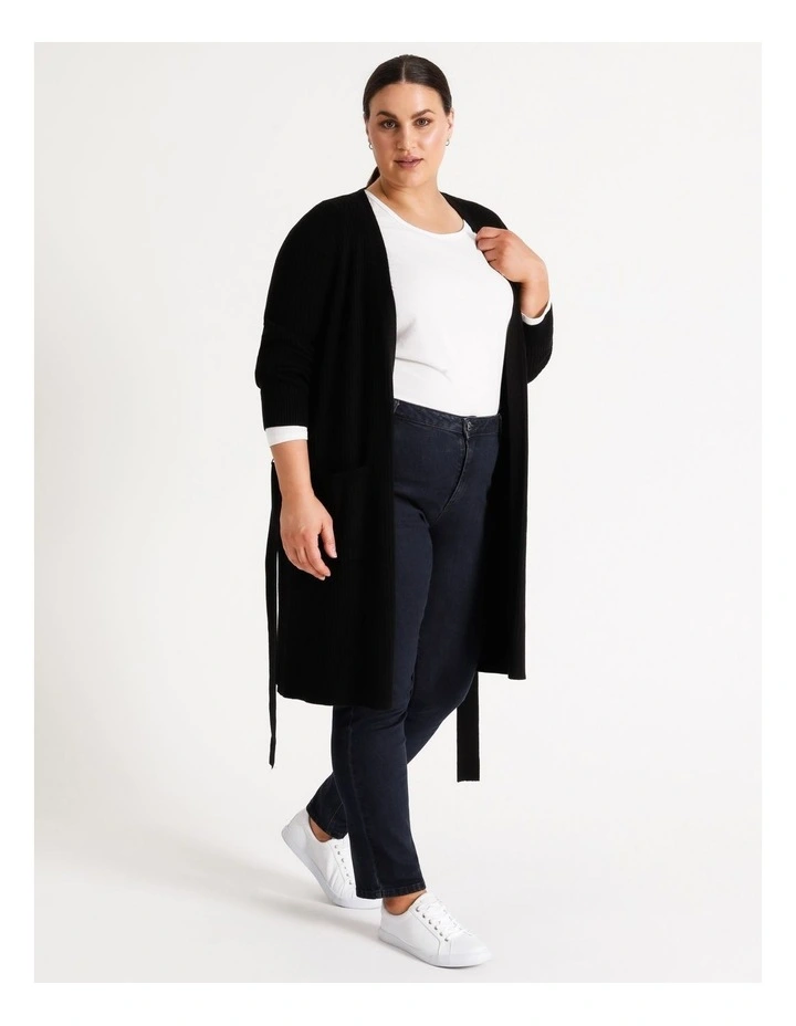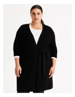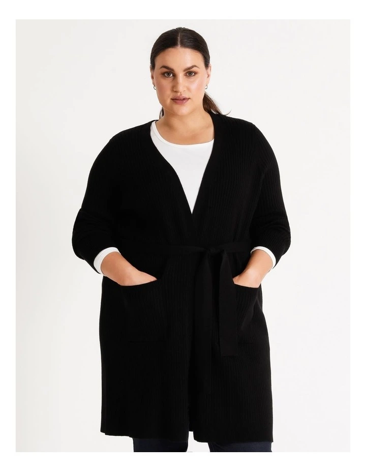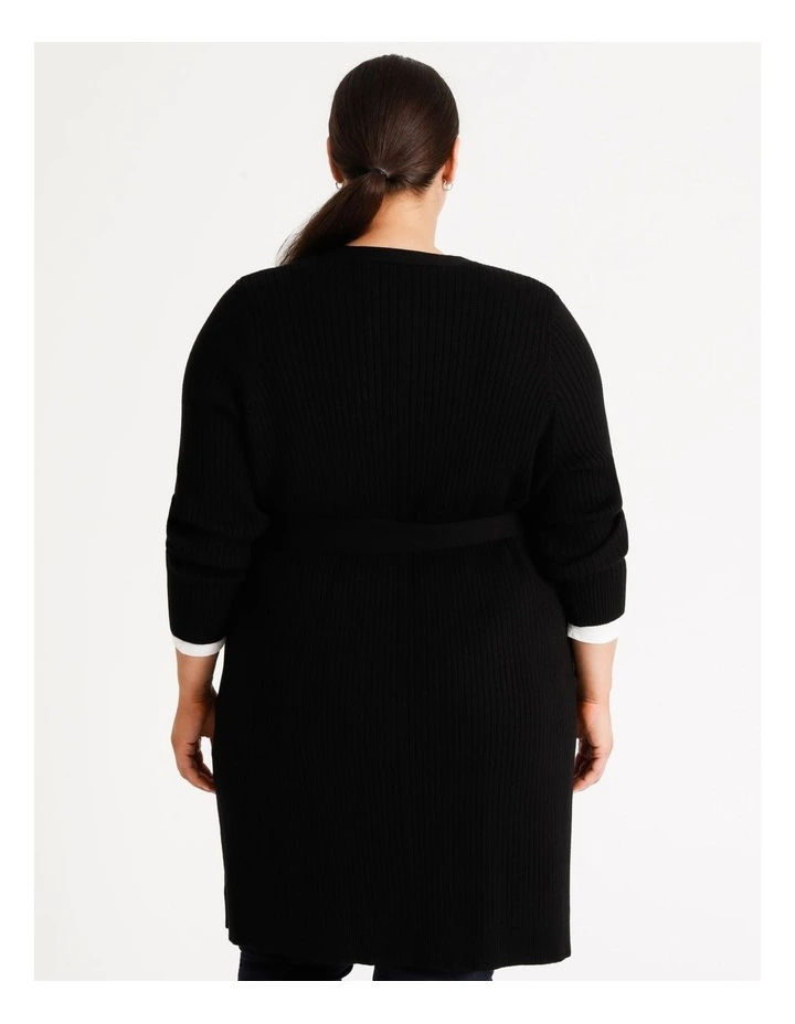 Round out your everyday wardrobe with a longline cardigan. This fashion-forward cardigan has a longline design with a ribbed knit finish and sash at the waist for a cinched silhouette. Style it with wide-leg pants for a chic look.