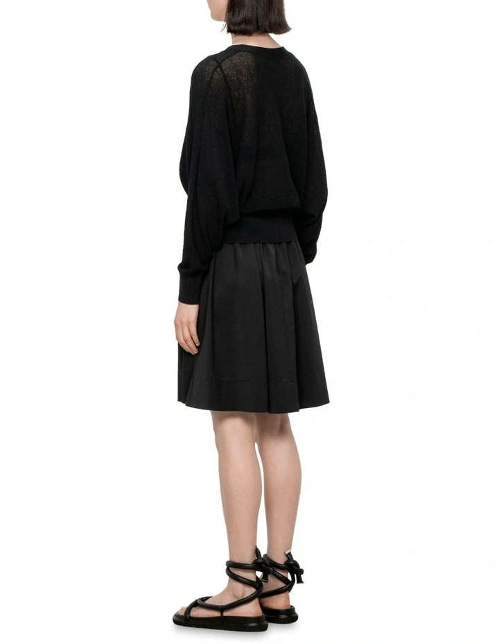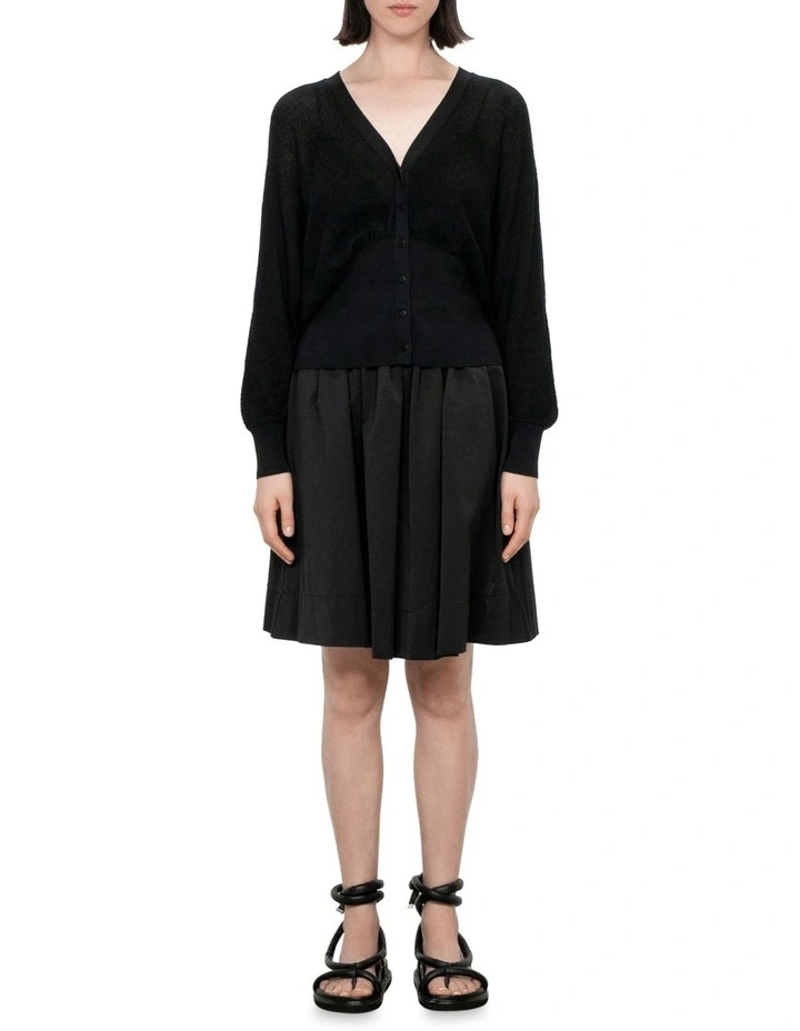 Crafted from our cotton nylon blend yarn, this knit offers a unique sheer crepe texture that will make summer dressing effortless. This cardigan features a loose blouson shape defined by batwing sleeves and a basque waist. Pair with relaxed trousers and strappy sandals for the perfect summer look.